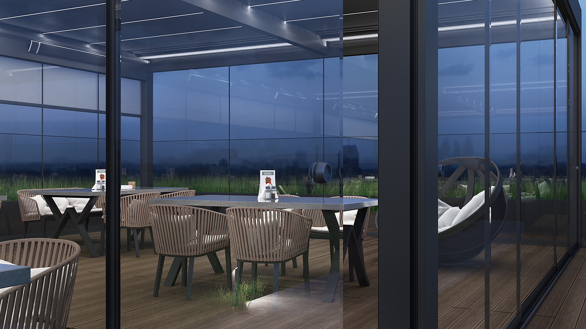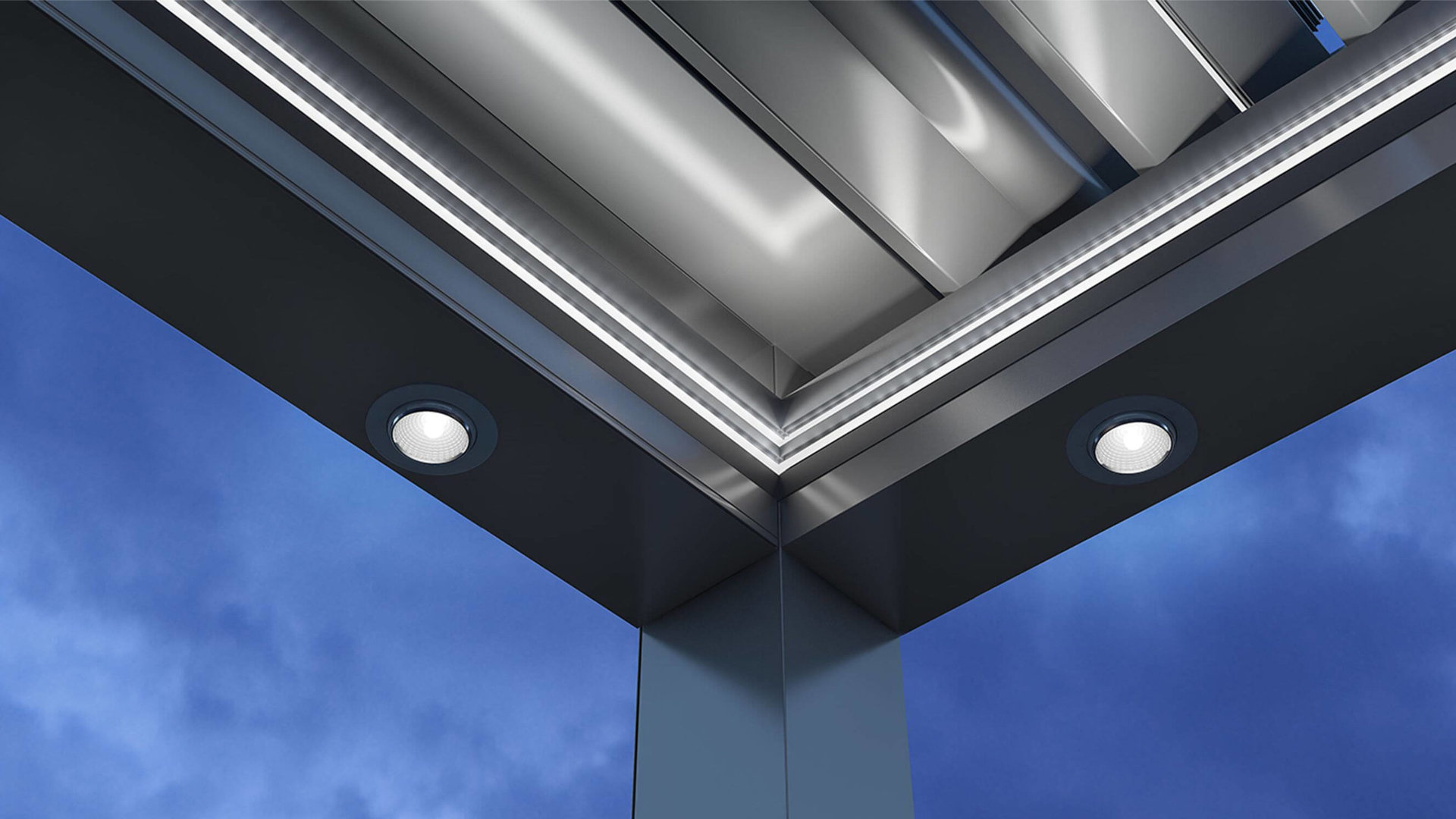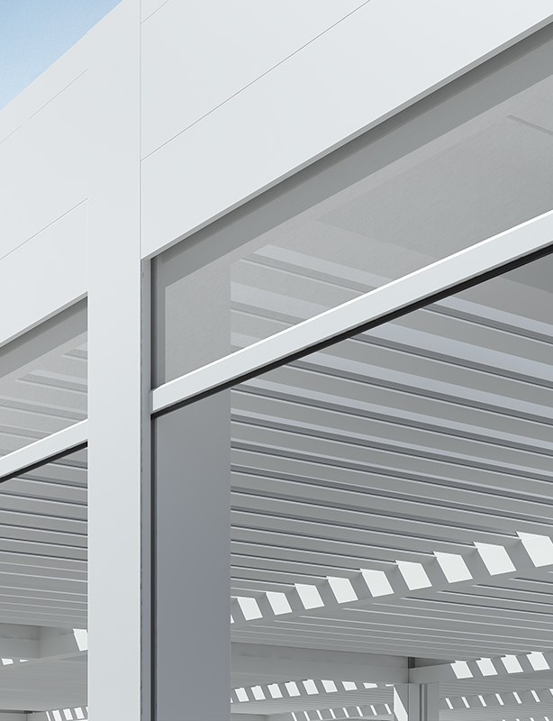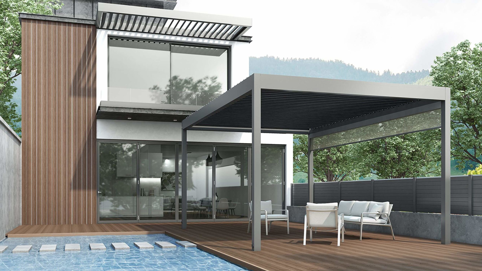 Σύστημα πέργκολας με περιστρεφόμενες περσίδες για ρυθμιζόμενη σκίαση και προστασία από τη βροχή. Ιδανική για τη μετατροπή ενός ανοιχτού χώρου σε ένα άνετο και ευχάριστο περιβάλλον. Η Μykonos υιοθετεί τη βιοκλιματική λογική και εγγυάται ελεγχόμενες συνθήκες διαβίωσης, και προσφέρει minimal και κομψές κατασκευές έως 6.2 x 4.5 m.